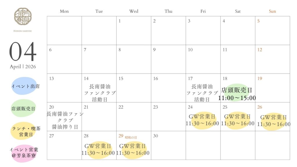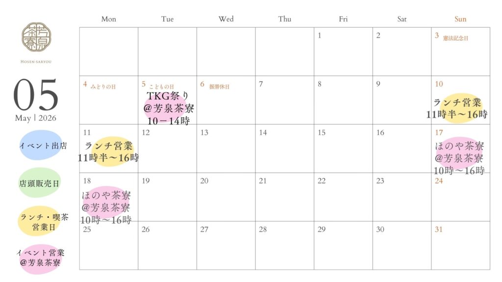 芳泉茶寮 2026年4月、5月の営業予定